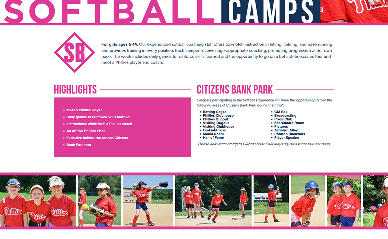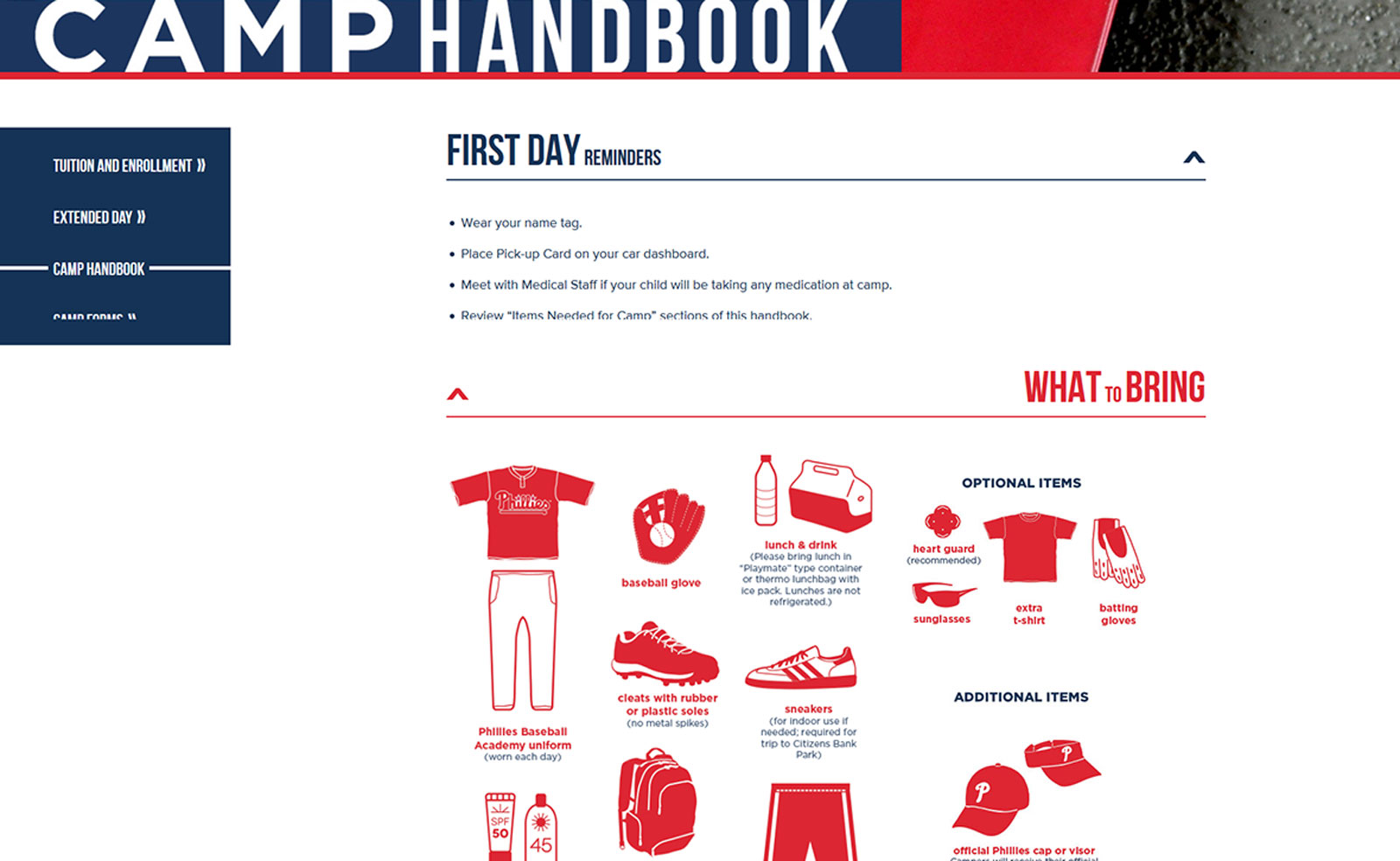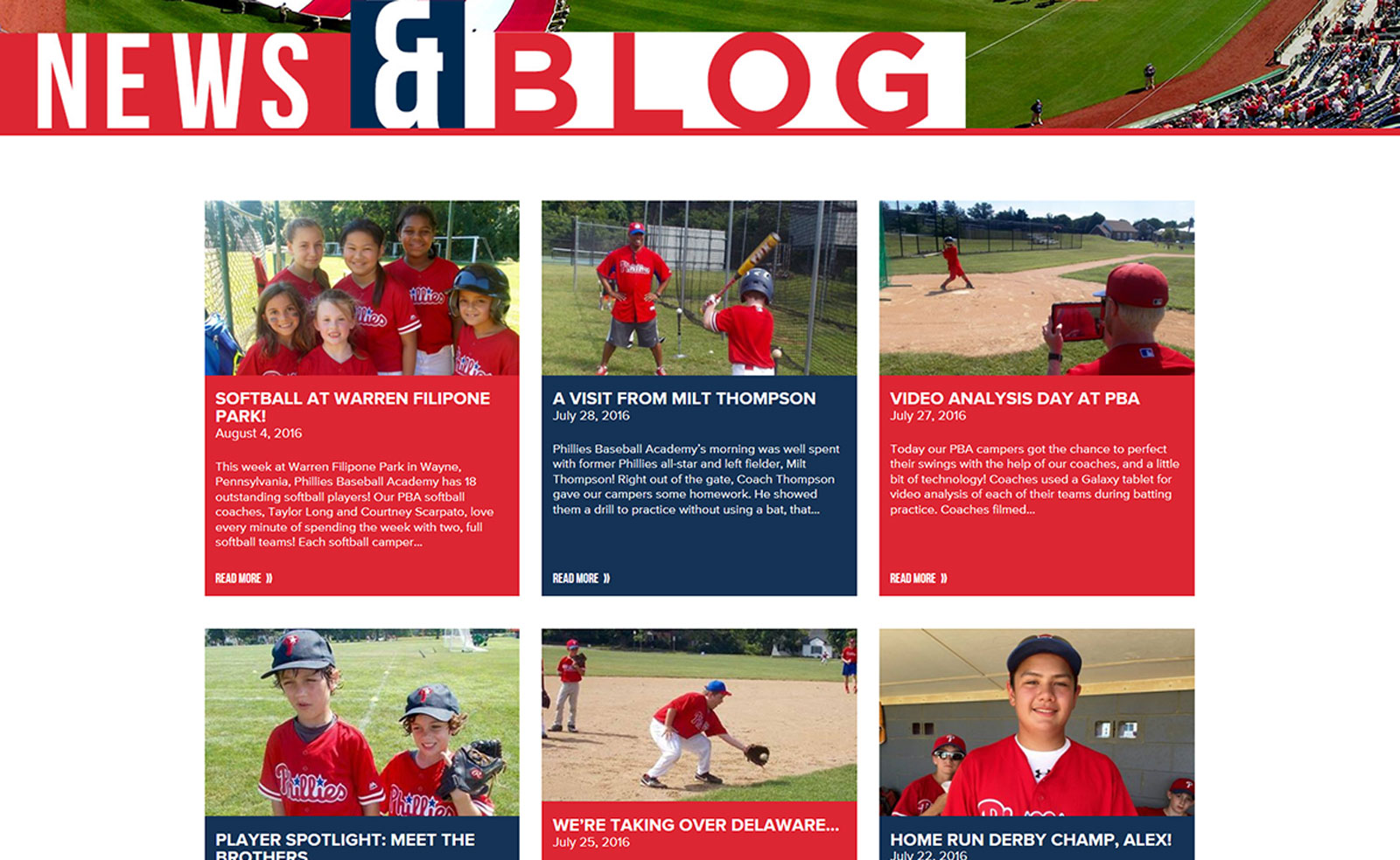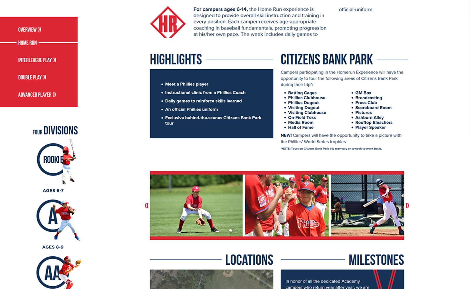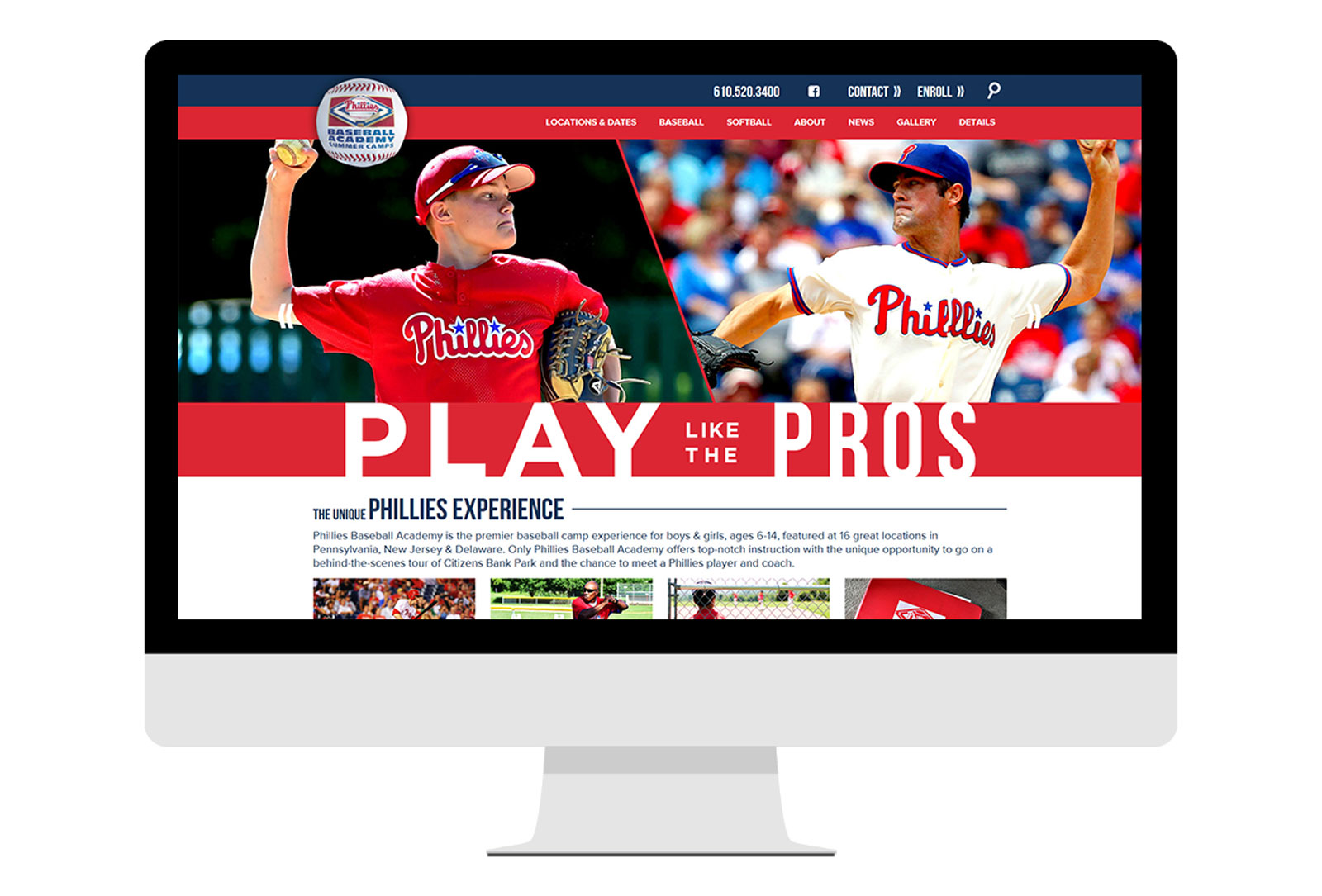 The Phillies Baseball and Softball Academy is the official summer camp of the Philadelphia Phillies. The existing academy logo was outdated and the website was unorganized and uninspired. We were tasked with doing a complete overhaul and re-branding of the academy website and identity so that it could stand as a proud part of the Phillies’ brand. We worked closely with the Phillies and MLB to create a drastic but eye-catching new responsive design that would improve it’s appeal to potential campers and their families and bring the academy into the modern age.